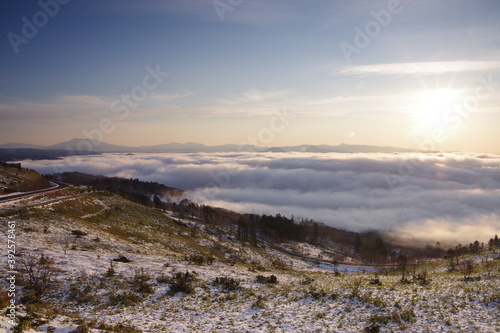 冬の朝。雲海の広がる峠からの眺め。