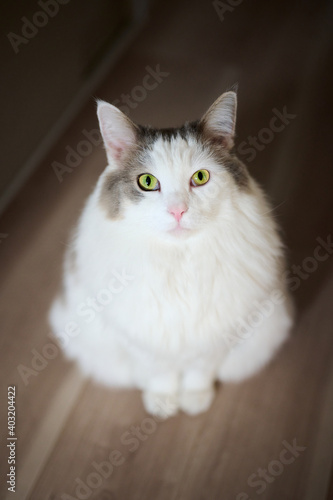 家の中の木のフローリングの上に立っている白猫のハイアングルショット
