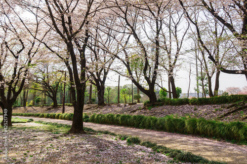 満開の桜並木と花びらが散る遊歩道/鶴ヶ島市運動公園(埼玉県鶴ヶ島市)