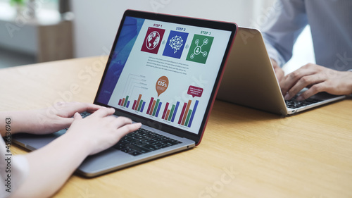 テーブルでパソコンを使う男女