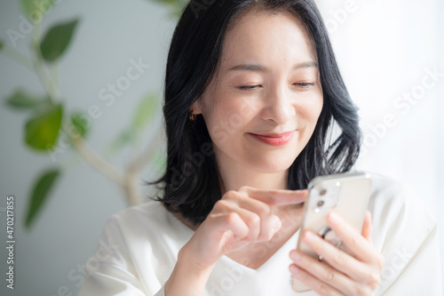 スマホでタップする美しいアジア人(日本人)女性 顔のアップ コピースペースあり