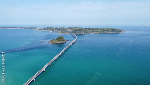 【角島大橋】山口県下関市豊北町大字神田自然と町並み~ドローン空撮 角島の青い海と空