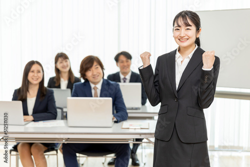 研修の講師とスーツ姿の男女(ガッツポーズ)