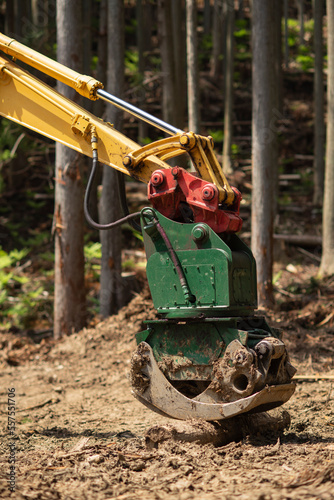 林道で作業するショベルカー