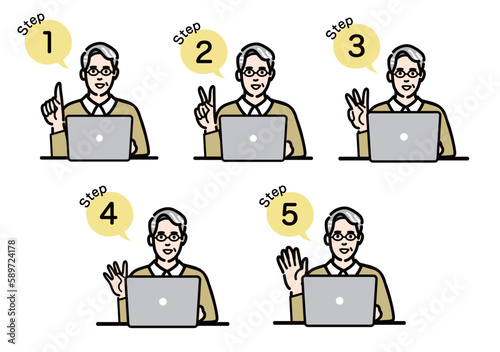 ラップトップの前に座って工程を説明するメガネをかけたシニア男性のセット