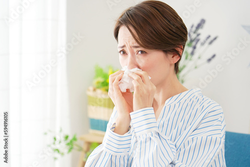 ティッシュで鼻をかむ女性
