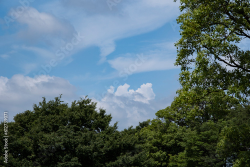 夏、梅雨明け、さわやかな晴天の青空と折り重なったふわふわの積乱雲、新緑の森林、山の木々の背景 夏休み・天気・アウトドア・旅行・バカンスのイメージ