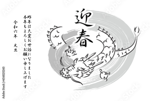 手描きの龍、ブラシストロークの背景の年賀状(賀詞・添え書きあり)