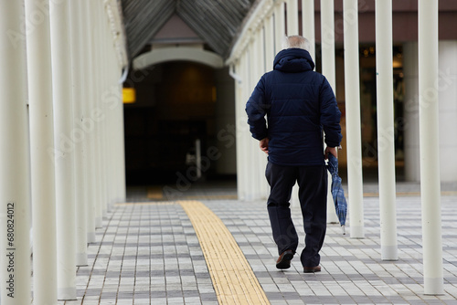 男性、一人、健康、元気、冬、季節、老人、高齢者、高齢化社会、後姿、買い物、街、ライフスタイル、人物、日本人、都市、歩く、散歩、後ろ姿、屋外、日本、通り、アーバン、シティ、人、買物、道、歩行、シニア男性、孤独、寂しい