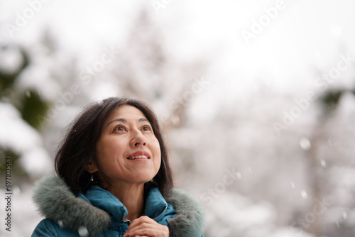 雪の中を楽しむ中年女性