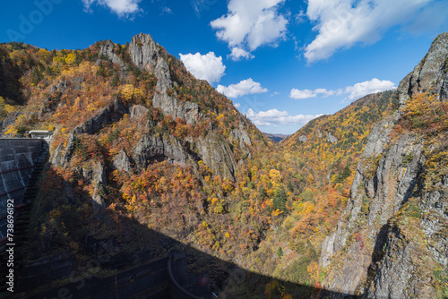 日本 北海道札幌市南区定山渓にある豊平峡ダムから見える渓谷と千丈岩と紅葉