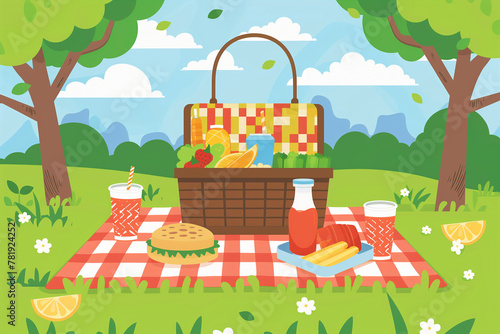 여름 공원에서 잔디에 담요에 음식 음료와 피크닉 바구니의 평면 디자인, 벡터, 일러스트.