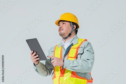 タブレット端末を見る作業服の男性