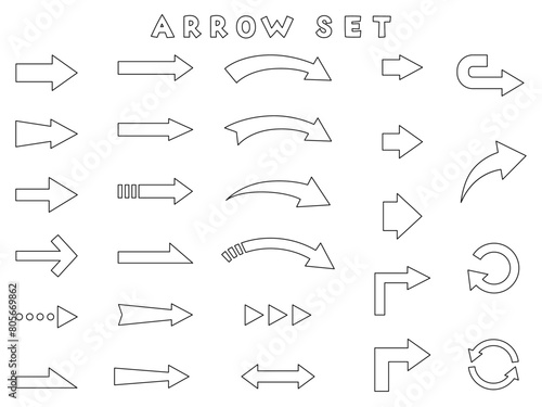 矢印のベクターイラストセット。やじるし、線、線画、アイコン、シンプル