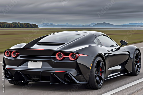 光沢のあるブラックとレッドのスーパーカーが広い田園地帯を走行する様子。エアロダイナミクスデザインとダブルテールライトが特徴的で、エキゾチックな魅力と高性能なエンジンが融合したスタイリッシュな一台。