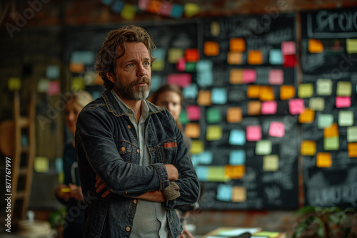 付箋の沢山貼ってあるボードの前で何かを説明する男性