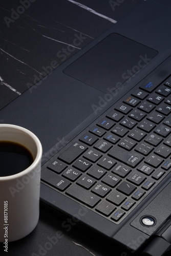 淹れたての美味しいコーヒーを飲みながら、ノートパソコンでデスクワークをしているイメージ