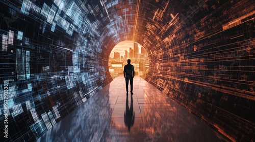 分割画面効果:別の世界をつなぐ量子トンネル、未来的な都市景観、コピースペース