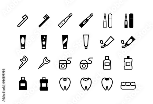 歯ブラシ・フロスなどのデンタルケアグッズのベクターアイコンセット