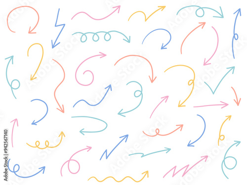 手書きの矢印アイコンのベクターイラストセット。方向、手描き、シンプル、やじるし