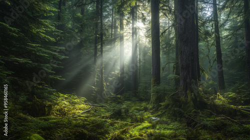 霧の森を照らす神秘的な陽光