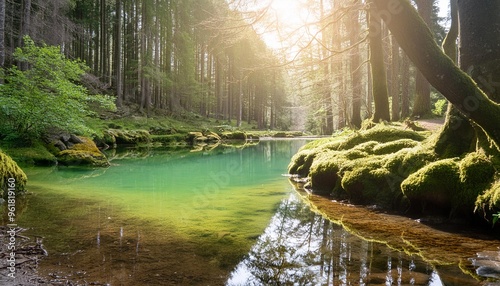 うつくしい森の中の緑色の水をたたえた泉 小川 春