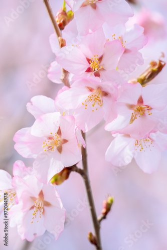 晴れた日に可愛らしく咲いた薄いピンク色の桜の花。背景はボケ。幸せを感じさせる美しさ。