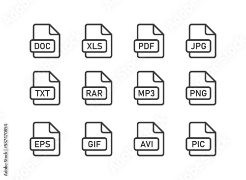 File type icon set on light background. Document formats symbol. Folder, web, file. Outline style. Flat design. Vector illustration