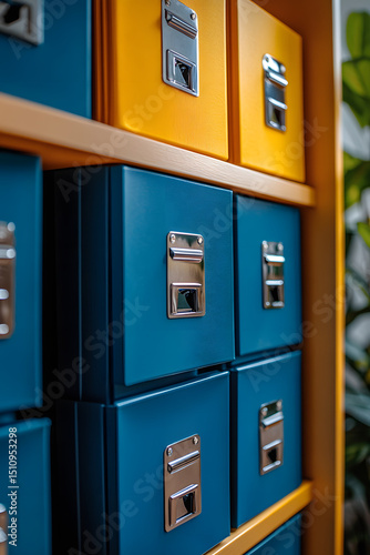Filing cabinet displaying organized office folders in vivid blue and yellow, chrome handles and fasteners, document storage