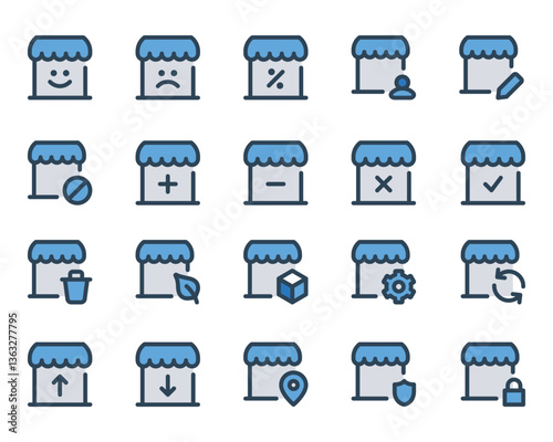 Filled blue outline icons set for Shop, store, market.