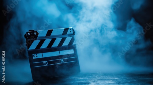 Film Clapboard on Foggy Set with Dramatic Blue Lighting