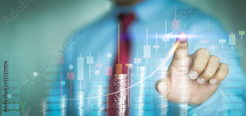 Finance and business concept. Investment graph and rows growth of coins, blue color tone. business and financial and investment data, analysis customer growth graph,business planning,strategy.
