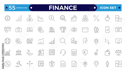 Finance outline icon set with money, bank, check, law, auction, exchange, payment, wallet, deposit, piggy, calculator,Business, Profit, Investment, Bank, web icon. Editable stroke outline icon.