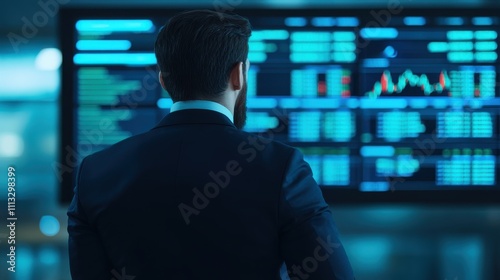 finance stocks advisory Concept. A professional analyzing financial data on digital screens in a corporate setting.