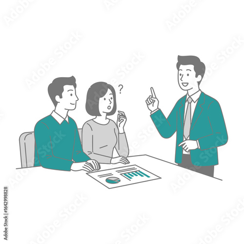 Financial Advisor Illustration: An advisor points towards a financial document as the couple sitting with them looks at them and is wondering what is said.