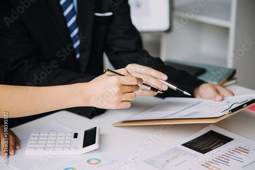 Financial analysts analyze business financial reports on a digital tablet planning investment project during a discussion at a meeting of corporate showing the results of their successful teamwork.
