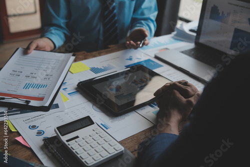 Financial analysts analyze business financial reports on a digital tablet planning investment project during a discussion at a meeting of corporate showing the results of their successful teamwork.