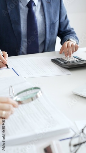 Financial analysts examining documents, using magnifying glass and calculator while studying corporate data at workplace. Audit and taxes in business