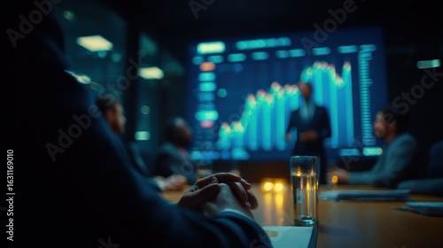 Financial Analytics Meeting: Business Professionals Analyzing Stock Market Data in a Modern Conference Room