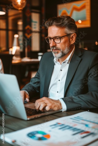 Financial Benchmarking Analysis by Investment Advisors in Modern Office with Market Reports and Charts