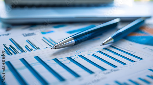 Financial business background with graphs, stacks of coins and pen for writing. AI Generated