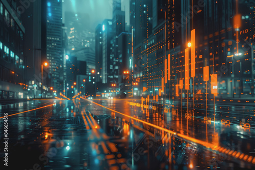 Financial chart graph shining in the city with business and blurred night scene in the background.
