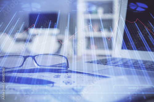 Financial chart hologram with glasses on the table background. Concept of business. Double exposure.