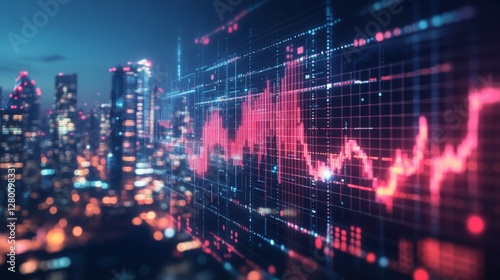Financial data analysis illustrates market trends against a modern city skyline at dusk