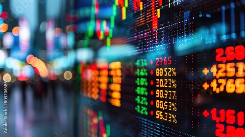 Financial Data Display: A vibrant close-up of a digital display showcasing fluctuating stock market data, with blurred city lights in the background.