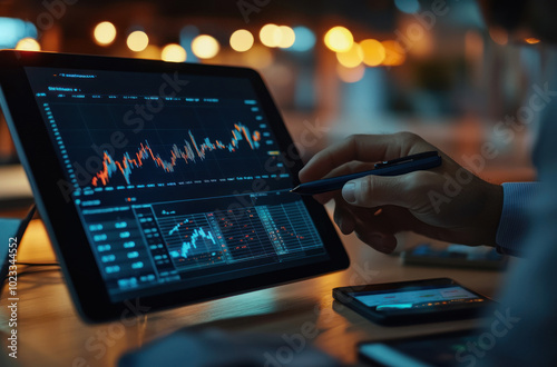 Financial data review on tablet in ambient setting.