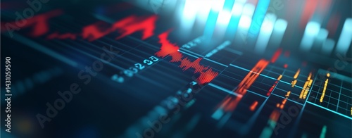 Financial Data Visualization: A complex network of intricate lines and vibrant colors, the image vividly depicts financial data with an emphasis on stocks, trends.