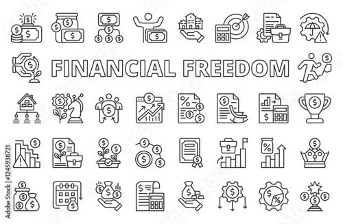 Financial freedom, icons in line design. Financial freedom, wealth, independence, money, investment, savings, success on white background vector. Financial freedom editable stroke icons