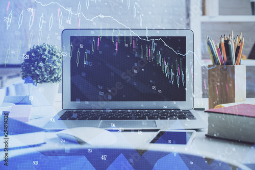 Financial graph colorful drawing and table with computer on background. Double exposure. Concept of international markets.