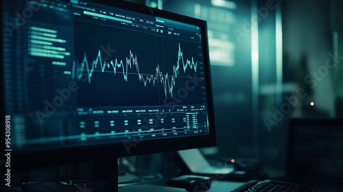 Financial graph on a monitor with a dark background and highlighted trend lines
